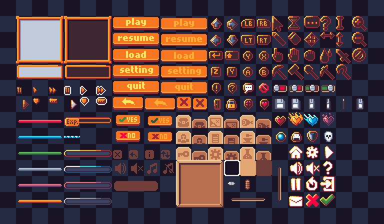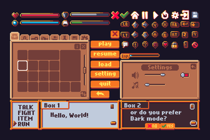 Plain GUI with my favorite palette, built it with RPG elements in mine, can be use for any type be it a top down adventure, side scrolling, or a farming sim.